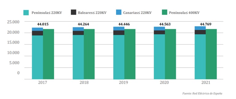 La longitud de circuito total de la red de transporte y distribución está en torno a los 45.000 km. El crecimiento de la red que se observa en la figura que sigue, se ha mantenido entorno a los 200 km anuales y ha respondido a un crecimiento vegetativo, claramente insuficiente para cumplir los objetivos de la transición energética.
